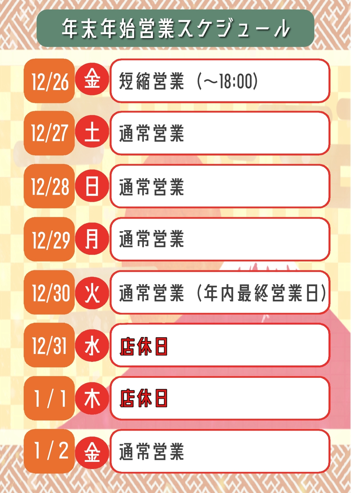 12/26(金)のみ18時閉店となりますのでご注意ください。